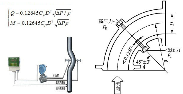 流體流過彎曲管道(如圖所示)時,因流向改變產生慣性離心力,彎管外側與內側間形成壓差P(P=pg-pd),流量的大小與該壓差的平方根成比例關系! 流量計