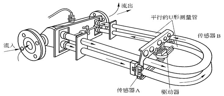 科里奧利質量流量計 (簡稱CMF)是利用流體在振動管中流動時, 音叉物位開關 產生與質量流量成正比的科里奧利力而制成的一種直接式質量流量儀表。 (一)基本結構和工作原理 雙U形科里奧利流量傳感器的結構如下圖: 工作原理 如圖,被測流體從U形管流過,其流動