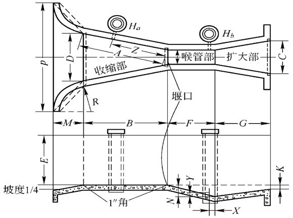 槽式流量計是在明渠水路中采用節流方法來測量流量的特殊測流槽,在節流的部位,水的流速增大,水位下降。測量由此產生的水位變化可以確定流量。水路節流的方式甚多,其中應用最廣泛的是巴歇爾(Pareshall)水槽,如下圖所示。